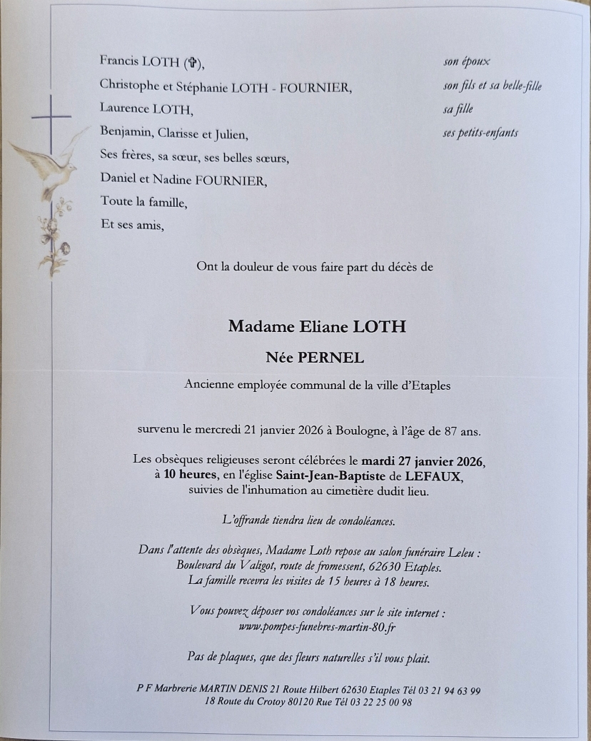 Avis de décès de Madame Eliane LOTH