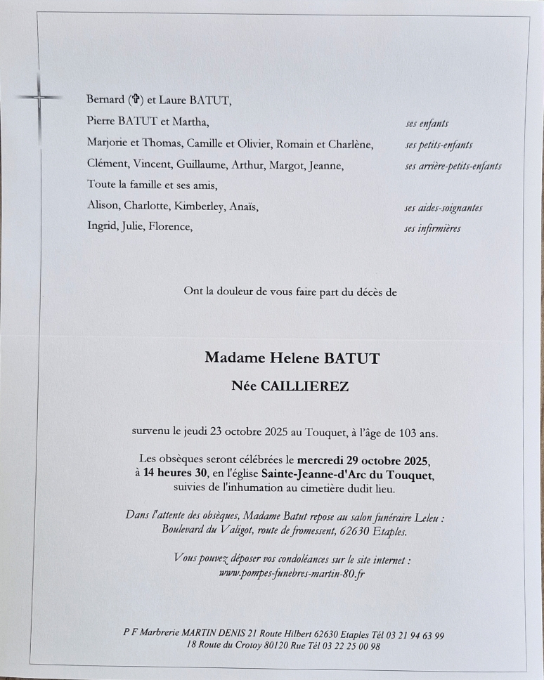 Avis de décès de Madame Helene BATUT née CAILLIEREZ