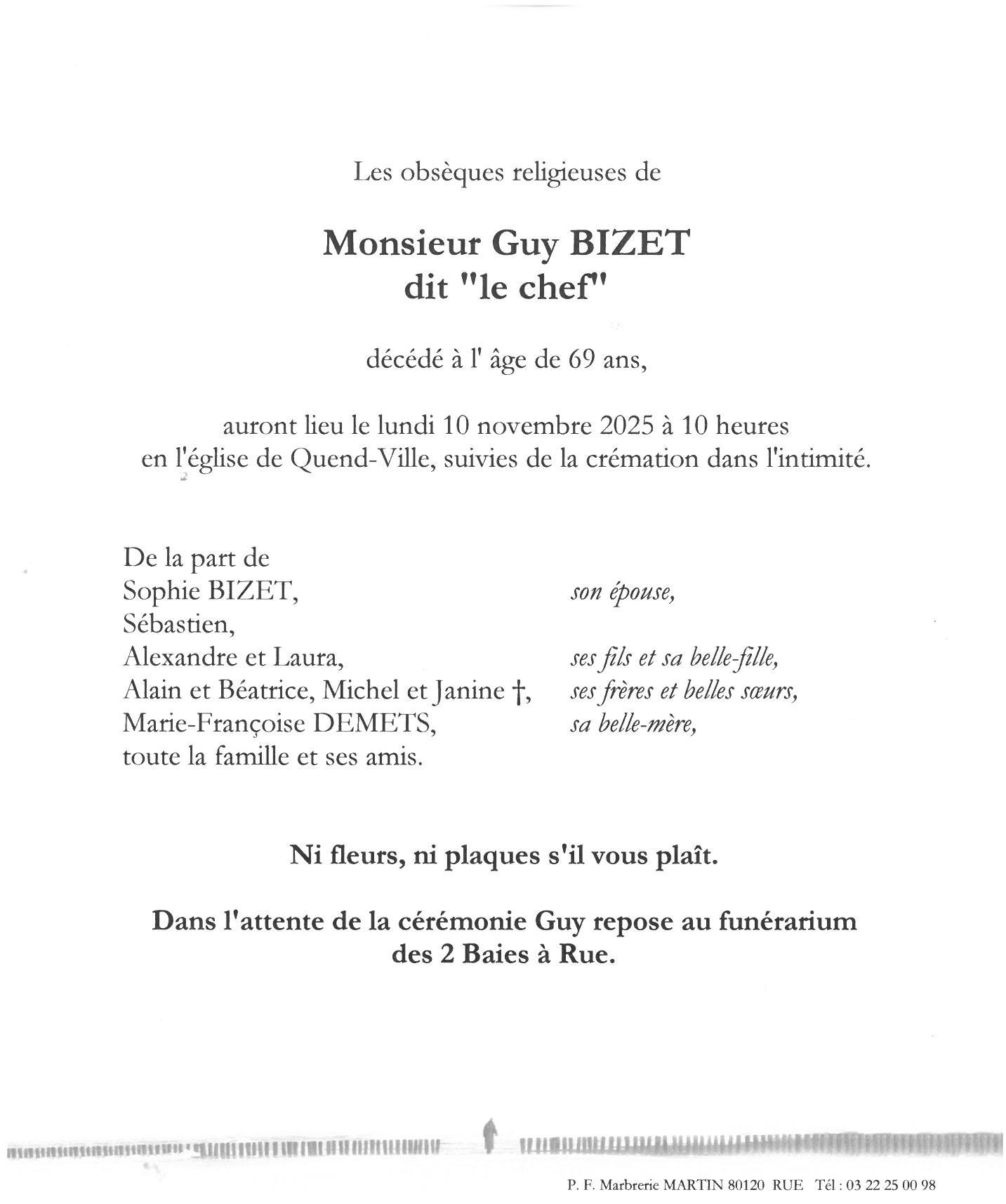 Cette page vous permet de présenter vos condoléances à la famille et de partager l'avis de décès de Guy.