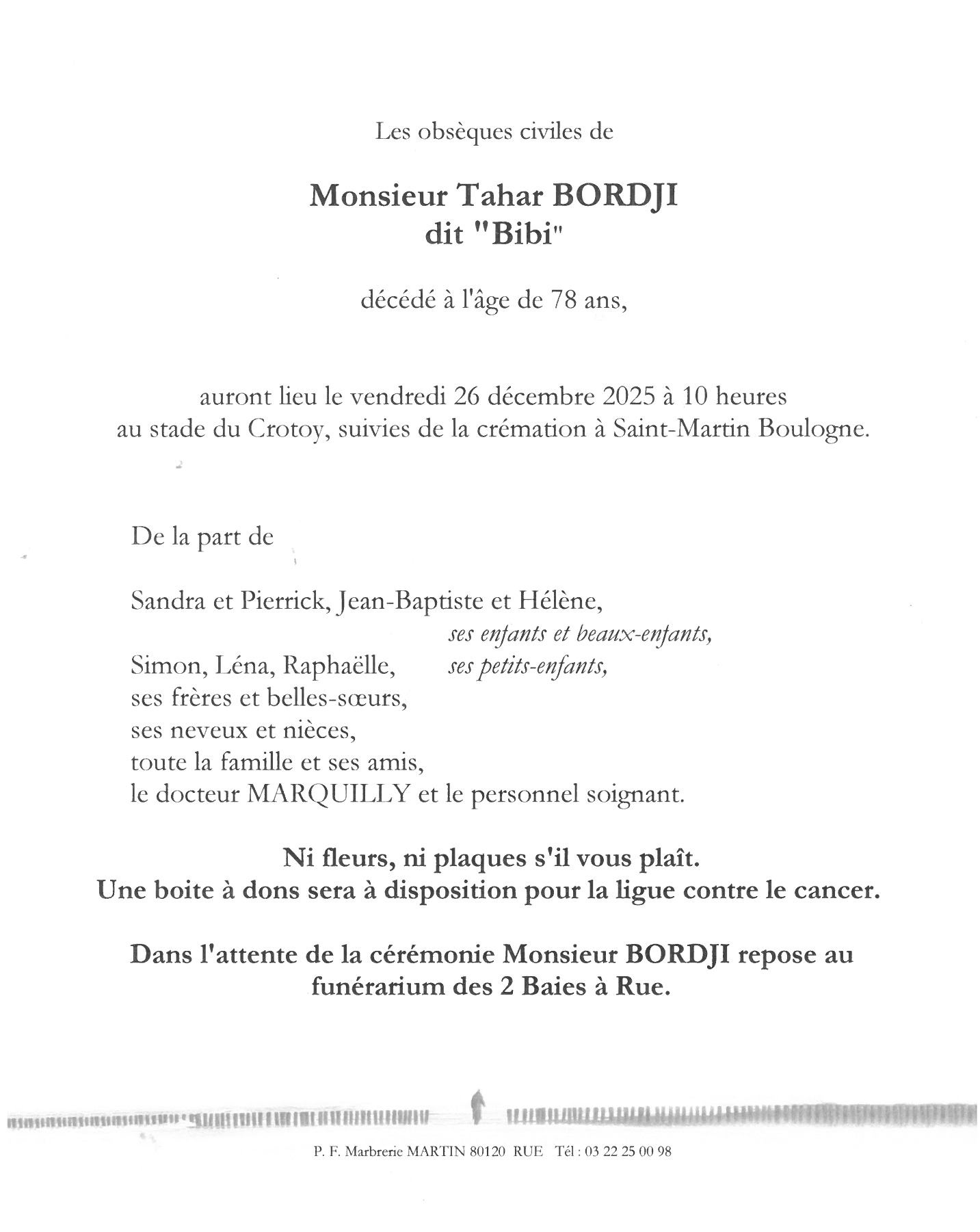 Avis de décès de Monsieur Tahar BORDJI